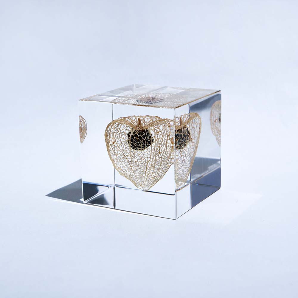 Handcrafted transparent cube preserving Chinese lantern plant—a fruit whose shape and vibrant color resemble a traditional lantern.