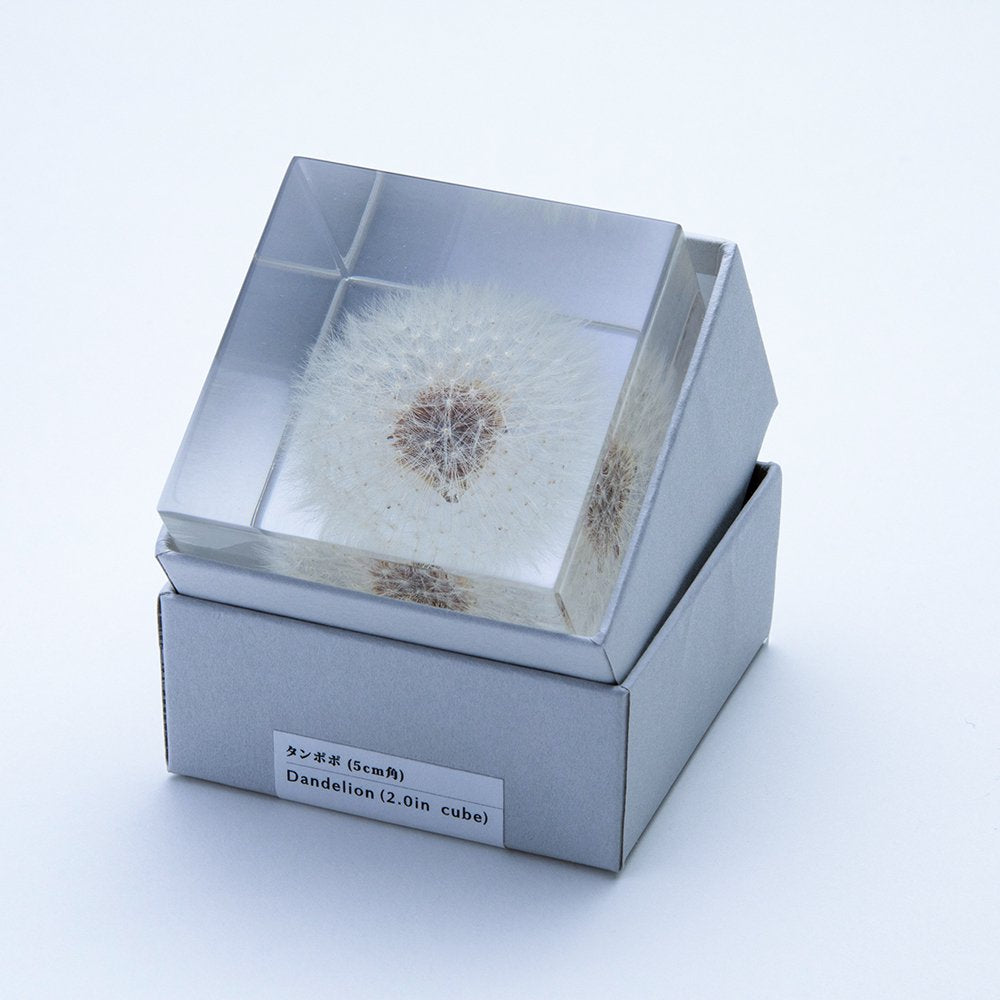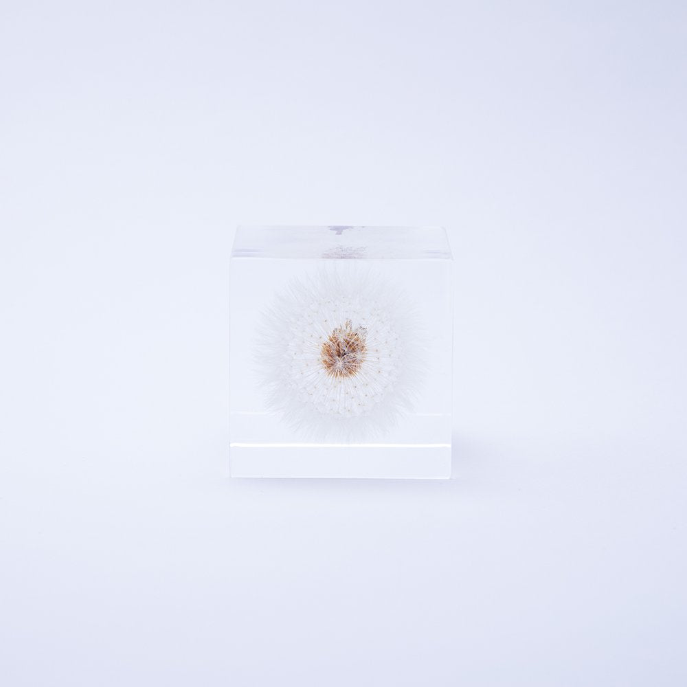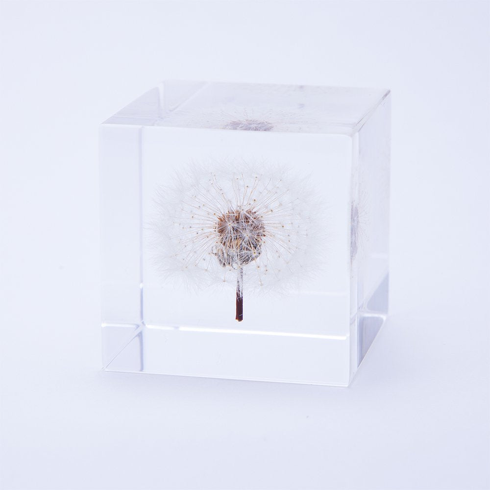 Handcrafted transparent cube preserving a dandelion in full, fluffy bloom.