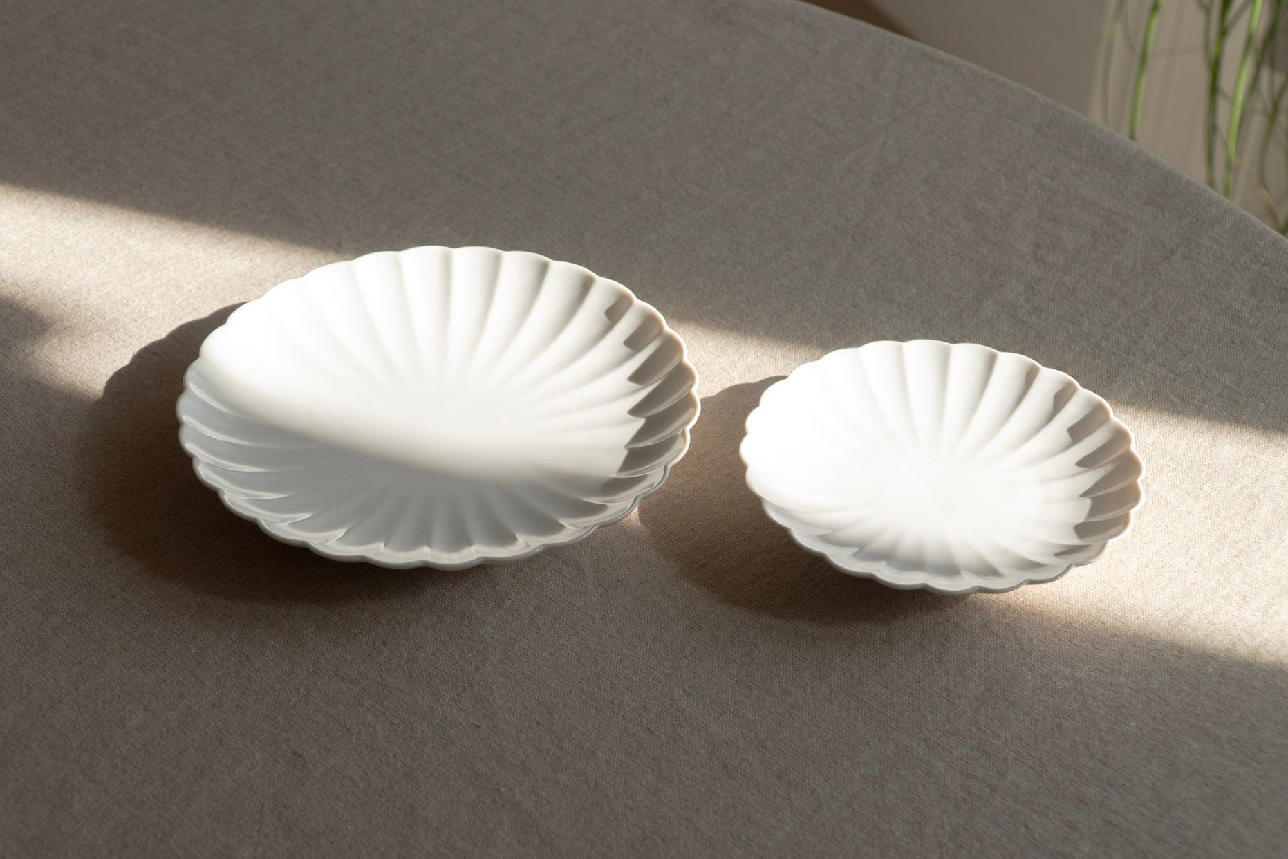 This flower plate series reimagines the kaiseki-style plates originally produced at the family kiln, adapting traditional forms and dimensions for home dining. The kiku (chrysanthemum) shape lends calm elegance to your table.